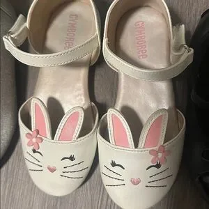 Adorable set of girls' dress shoes. Includes silver glitter, white with bunny design, black patent, and white.