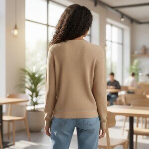 womens sweater, royal robbins, knit pullover, camel sweater, winter top, casual clothing, neutral wardrobe, comfortable sweater, ribbed texture, everyday wear, soft knit
