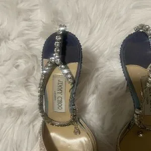 Stunning Jimmy Choo heels with glittering pink surface. Adorned with silver rhinestone straps. Ideal for glamorous events.