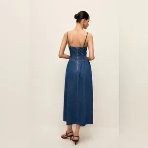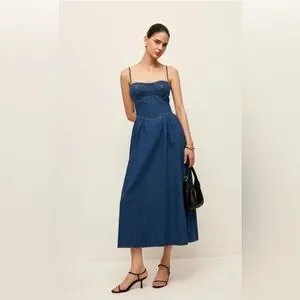 Commense Sweetheart Collar Dark Denim Dress. Sz Medium. NWT. Approx 34" chest, 30" waist, 52" length. Chic denim maxi dress with a fitted bodice and flared skirt. Perfect for casual outings. Adjustable straps. Back zipper. Composition: 80% Cotton, 8% Viscose, 12% Polyester. Sleeve Length: Sleeveless. Neckline: Heart-shaped collar. Perfect for any occasion & season. Add a long sleeve shirt & boots to winterize the dress! Fast shipping!
