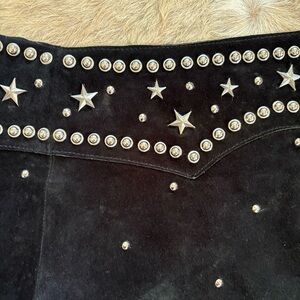 Stylish black skirt chaps featuring fringe and studded accents. Perfect for a bold look.