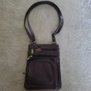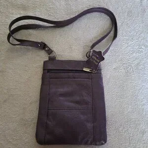 Steeltime Unisex Super Soft Leather Crossbody Bag with 6 compartments and Carrying Strap in Purple. This fashionable leather crossbody bag is made from 100% genuine leather. It is perfect for all your daily essentials. With an adjustable shoulder strap and 6 compartments, this durable crossbody bag is designed for those on the go with a fashionable look. Its main compartment has a large storage capacity, and can hold your notebooks, tablets, and more important necessities. This genuine leather crossbody bag has 6 different size storage compartments featuring zippered pockets. Good clean condition.