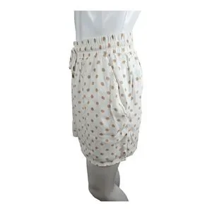 AFRM white high-waisted shorts featuring a playful polka dot pattern in a warm tan/brown. These stylish shorts have a comfortable smocked elastic waistband with an adjustable drawstring, ensuring a perfect fit. They also include convenient side pockets. Perfect for casual outings, beach days, or adding a chic touch to your everyday wardrobe. Excellent pre-owned condition, no visible flaws.