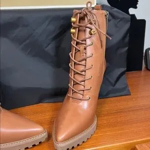 Chic tan ankle boots with lace-up design. Features gold-tone eyelets and side zipper. Stacked heel for added height.
