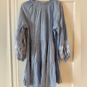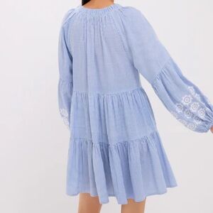 Chic blue coastal dress with white embroidery. Features a flowy design and tassel details.