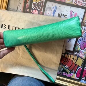 Chic Burberry clutch in striking green reptile print leather. Features a polished silver clasp. Metal on the inside has some tarnish / metal stain on the fabric slightly that dose not effect the use at all cobbler can fix with a velvet fabric strip. Bag comes with original dust bag