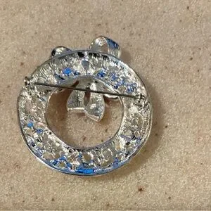 Charming silver-tone wreath brooch featuring a vibrant red bow and green accents. Ideal for festive occasions.