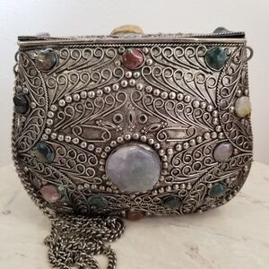 Exquisite vintage Sajai metal handbag featuring ornate embossed filigree detail and genuine agate cabochon stones in shades of green, amber, and cream. Handcrafted in India, this structured minaudière has a hinged top flap and long chain strap. A beautiful collector’s piece that bridges boho glamour and old-world craftsmanship — perfect for evening wear or as a global-style statement accent.