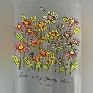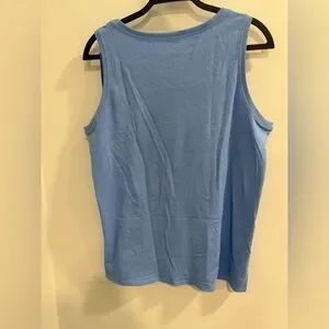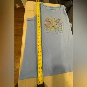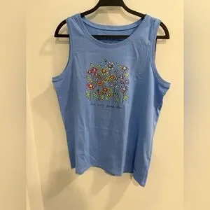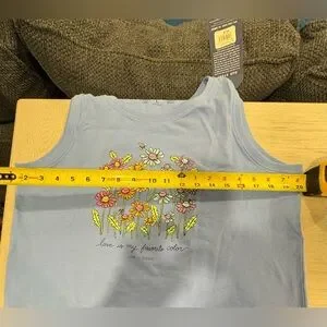 Light blue tank top featuring vibrant floral design. Sleeveless and casual. Ideal for sunny days.