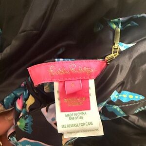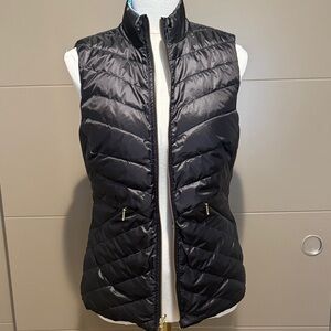 Vibrant puffer vest with floral and zebra print. Features a mix of blue, pink, and black colors. Reversible to a solid black with gold zippers.