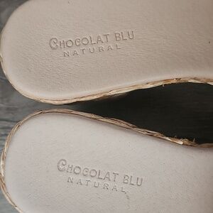 Elegant woven mules by Chocolat Blu. Natural tone with a stylish block heel. Perfect for casual outings.