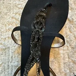Elegant black sandals with intricate beaded design. Gold accents add a touch of luxury. Perfect for any occasion.
