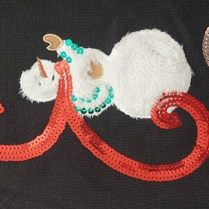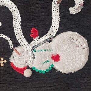Black vest with colorful sequin faux fur snowman embroidered applique design. Features red, green, and silver sequin detail accents.