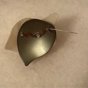 VINTAGE WOMENS BROOCH PIN 1940s MCM CELLULOID PLASTIC 2 LARGE WHITE CALLA LILY FLOWERS YELLOW CENTERS ON GREEN LEAF