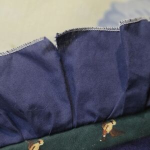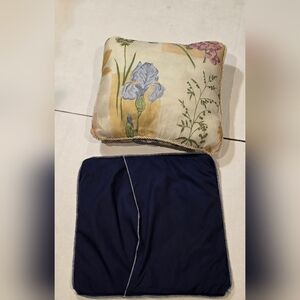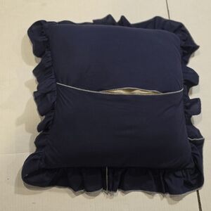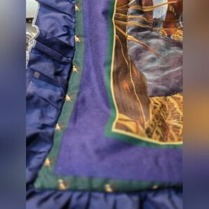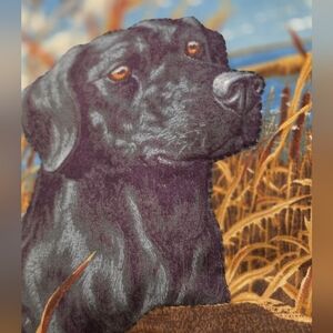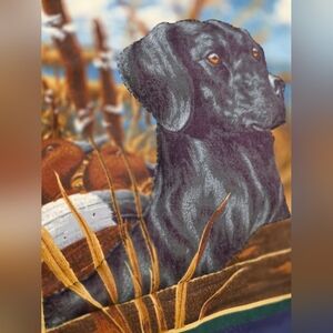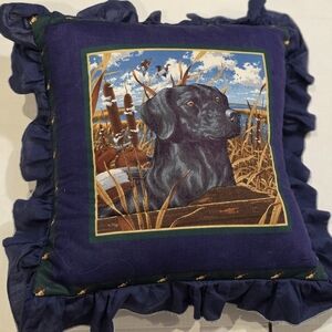 Vintage toss pillow 16 X 16 2 1/2 inch ruffle. This is a Black Labrador dog with ducks & a lake. The Black Lab was made to be puffed out with a stuffing behind it & hand sewn. There is one small flaw as shown. It comes with the toss pillow.