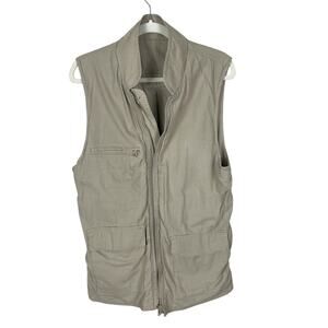100% cotton fishing vest with several pockets to outside and inside. Mock neck with button closure, full zip front with a top and bottom button closure. Elastic back with adjustable sides. Tan. Size XS. Please see photos for measurements.