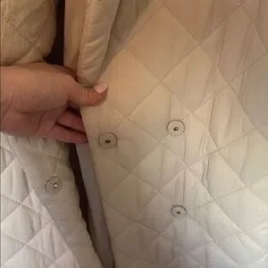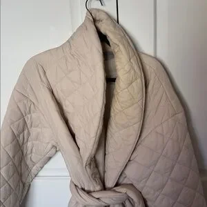 Luxurious quilted long puffer with high collar, waist tie and snap closures. Perfect for cold weather. Slightly discoloration on inside of collar