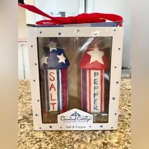 New! Johanna Parker 4th of July bundle. Cream and sugar set, salt and pepper, Uncle Sam mug.