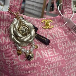 Stylish pink Chanel tote with iconic logo design. Features elegant gold accents and a decorative flower charm.
