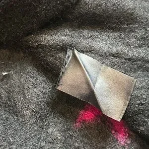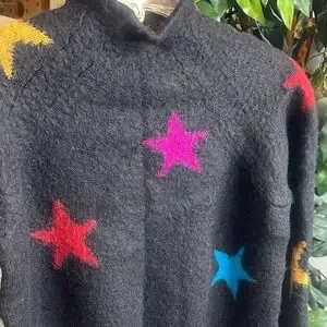 Black with multicolored (yellow, pink, red, & blue) star printed wool (100% Alpaca Wool). Sweater. Long sleeves.