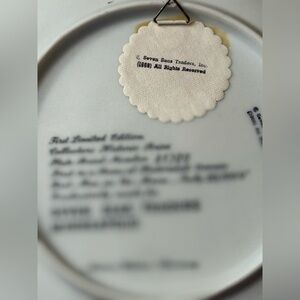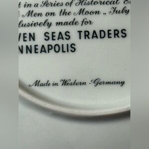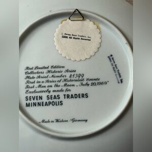 The product is a commemorative plate celebrating the Apollo Moon Landing on July 20, 1969. Produced by Seven Seas Traders Inc, this first edition plate marks a significant event in history, featuring the astronauts who made the first manned Moon mission. The plate pays tribute to the bravery and achievement of the NASA astronauts involved in this exploration mission, making it a valuable collectible item for enthusiasts of space travel and historical memorabilia. Made in West Germany, this unique piece captures a momentous moment in space history.