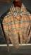 Stylish Burberry plaid shirt. Features tan, black, and red pattern. Button-up design.