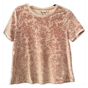 Chic blush velvet top with intricate floral pattern. Soft texture and elegant design. Size Small.