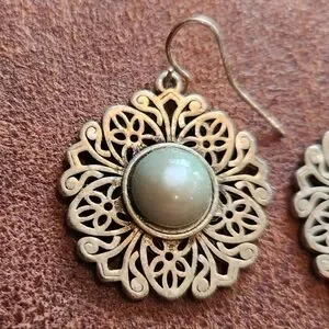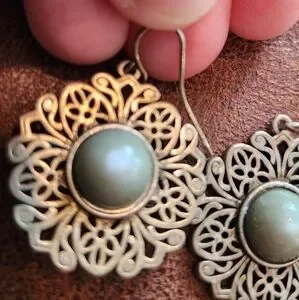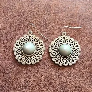 These elegant sterling silver filigree earrings feature intricate cut-out detailing, with grey-green stone in the center, and a fishhook clasp. Perfect for adding a touch of sophistication to any outfit.