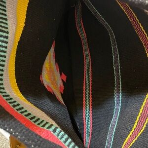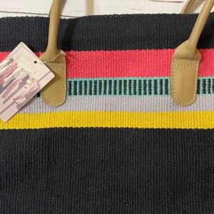 Ecote woven tote bag from Urban outfitters. Bright vibrant colors. Fabric has a textured “tapestry” or carpet-like feel. Velcro tab closure in center of top of bag. It is unlined and has no interior pockets. Leather straps. Brand new with tags. Measurements provided in photos.