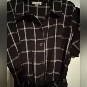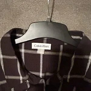 Elegant Calvin Klein shirt with a dark plaid design. Ideal for versatile styling.