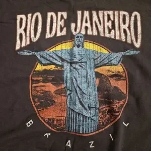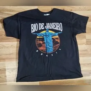 Black t-shirt featuring a Rio de Janeiro graphic with vibrant colors.
