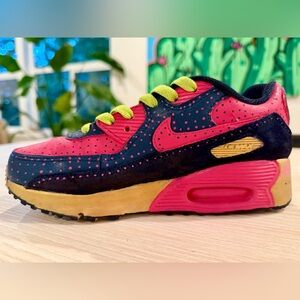 Vibrant Nike kids shoes. Features pink upper with blue and yellow accents. Perfect for active play.