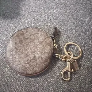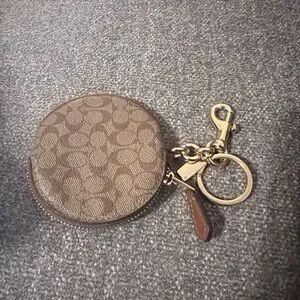 Elegant Coach coin holder with keychain. Signature brown pattern. Perfect for essentials.