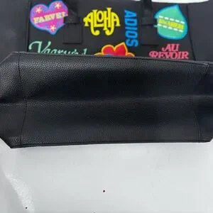 Stylish Disney Small World black tote with vibrant patches. Features playful designs and text. Perfect for casual outings.