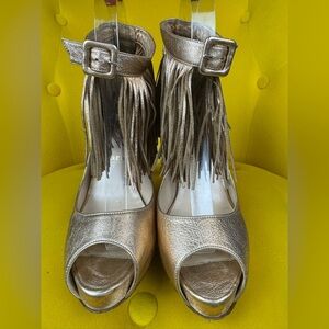 Step out in style with these elegant gold peep-toe heels. Perfect for any occasion, these shoes offer a chic and sophisticated look. The shimmering gold color adds a touch of glamour to your outfit in good condition rubbing, scratches see pictures thank you.