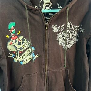 Ed Hardy hoodie with striking black and white graphics. Features bold designs and iconic style.