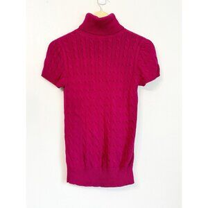 Short-sleeve turtleneck sweater. Cable knit design. Soft and stylish.