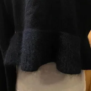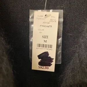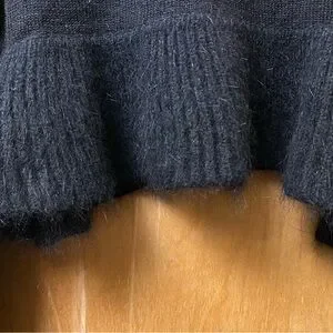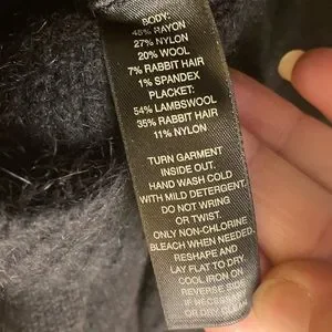 This sweater is made of lambswool, rabbit hair, rayon, nylon, and spandex. It is one of the softest sweaters I've ever touched. Black with lighter black and some various white hairs mixed in (assuming the rabbit hair) as shown in close up photos.