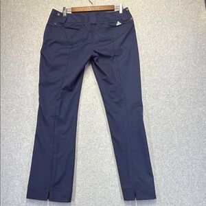 Experience the perfect blend of style and comfort with these adidas ankle cropped pants in a striking blue hue. Crafted for versatility, they offer a sleek silhouette ideal for both casual outings and smart occasions. The structured fabric ensures a polished look, making them a wardrobe essential. Excellent used condition. All measurements are approximate laying flat