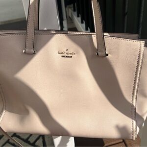 Stylish cream leather handbag with gold zipper detail. Larger in size with detachable and adjustable longer strap. Several pockets in the interior and on the outside. Kept in a smoke free home and rarely used so it’s in excellent condition.