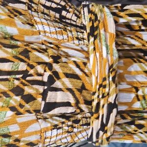 Stylish Free People button-up jumpsuit with a mix of colors. Features a unique pattern and button details. Belted Tie.