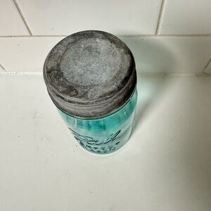 Classic Ball Perfect Mason jar in aqua with a gray lid. Ideal for decor or storage.