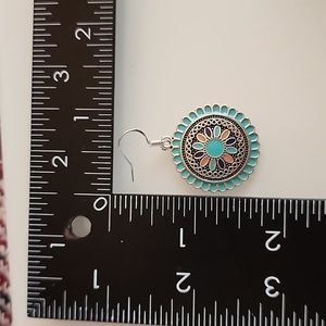 Round earrings with turquoise and black design. Intricate floral pattern. Silver accents.