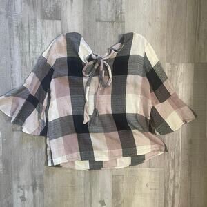 Ro & De Plaid Bell Sleeve Bow Back Blouse sz Medium. See photos. Tie in back is torn but still attached