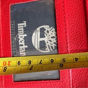 Sleek and stylish red leather wallet. Features Timberland logo. Perfect for everyday use.