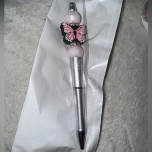 Elegant silver pen featuring a pink butterfly charm. Perfect for adding a touch of whimsy to your writing.
