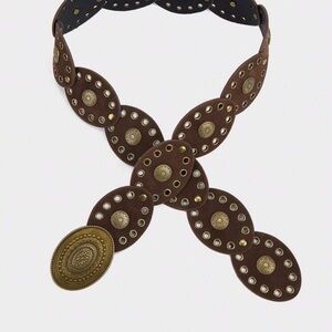 Add a touch of sophistication with this chic brown belt, highlighted by exquisite gold detailing. A perfect accessory to enhance your wardrobe.