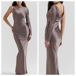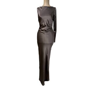 House of CB NWT Catiana Pebble Gray One Sleeve Satin Maxi Dress size XS