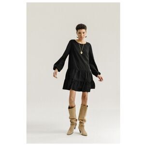 From Designer Molly Bracken, this ruffled black dress looks great paired with boots for a fun casual day look.