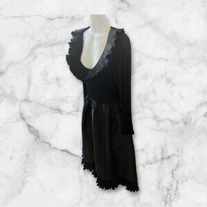 Bring on your glamour with this all-season special occasion dress from renowned designer, Jill Richards, who designed for high-profile clients including Nancy Reagan. Vintage black on black with dramatic ruffled neckline and coordinating hem. Full satin skirt with hidden pockets, half rear-zip, 3/4 sleeves. Top is lightweight - sleek like a leotard with stretch. Women's size S/M (based on approx measurements) - 31" skirt from waist, 16" across armpits, 22" sleeves. Pre-owned in very good condition. Newly dry cleaned.